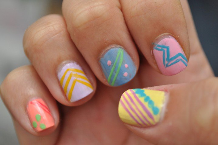Different patterns are made on each nail, the lovely colors and cute bunnies make this nail design even more girlish!