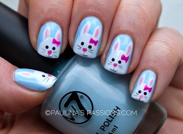 This nail design is incredibly cute with the those bunnies that wear fuchsia bows on their heads. The baby blue under painting creates a look of the blue sky.